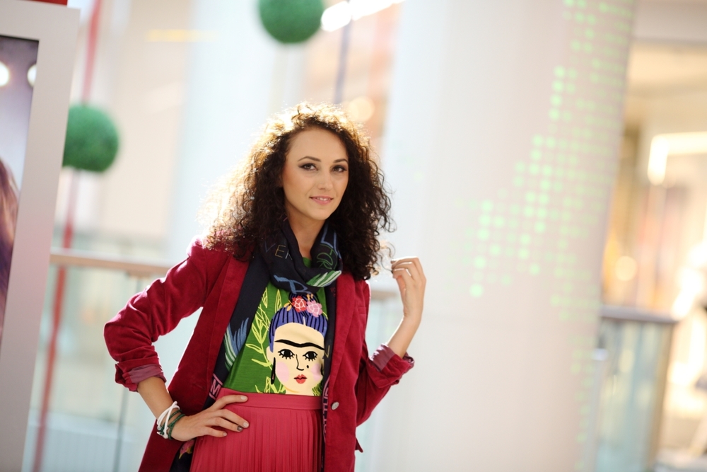 Сако Time Out; тениска Esprit; шал Esprit; пола Reserved; гривни Rosset; чорапи Contrabanda; кецове Foot Court